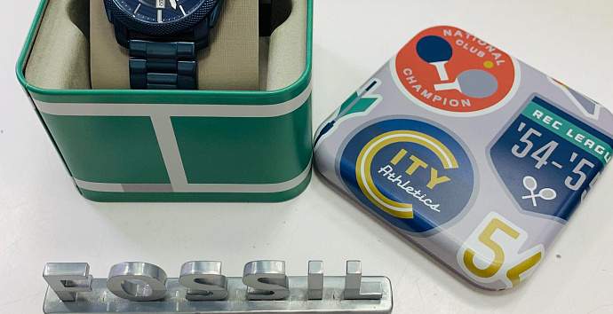 Часы FOSSIL Machine Three-Hand Date Blue-Tone Stainless Steel Watch.  На циферблате часов дополнительное окошко с указанием даты в положении "6 часов".  Браслет с раскладывающейся застежкой.