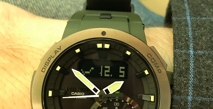 Наручные часы Casio PRW-7000 Multi-Field Line выпущены в мае 2017, предназначены для активных людей, поэтому многофункциональны. Они были и ранее, но появилось совсем уникальное решение. В нижней части циферблата есть еще одна шкала, она высчитывает приливы/отливы, являясь при этом настоящим «рыбацким календарем». Для заядлого рыбака такая информация позволяет точно высчитать оптимальное время для клева рыбы и отправиться за своей добычей. Функция идет дополнением ко всему функционалу, лишней она не будет, но никто прежде такой информации на циферблат не выводил. Модель Casio PRW-7000 не отличается уникальным и оригинальным дизайном, простота и лаконичность здесь в приоритете. Часы созданы для людей, которые постоянно выезжают за пределы города, которые редко одевают деловые костюмы. Такой пользователь будет больше ценить практичность, нежели уникальные дизайнерские решения. Супер светодиодная автоподсветка. При недостаточном внешнем освещении, поворот запястья обеспечивает яркую цветную подсветку дисплея часов.Необрит Специальное покрытие обеспечивает длительное послесвечение в темноте даже после кратковременного нахождения на свету.Tough Solar Питание от солнечной энергии.  Аккумулируя световую энергию, солнечная панель обеспечивает питание для работы часов. Кроме того часы на солнечных батареях имеют экономный режим работы при котором часы с полным зарядом могут работать без источников света несколько месяцев.Примерное время работы аккумуляторной батарейки без подзарядки от источника света: 6 месяцев (с полного заряда) Морозоустойчивость (до -10 С). Модуль часов рассчитан на работу при очень низких температурах. Цифра соответствует самой низкой температуре, при которой модуль работает. Устойчивость к температуре -10 °C не распространяется на датчик направления.Multi Band 6 Прием сигналов радиоволн, поступающих из шести разных радиостанций планеты, которые передают временные сигналы от определенных атомных часов. Радиоконтроль (Европа, США, Япония, Китай). Встроенный приемник обеспечивает отображение точного времени на территории почти всей Европы, США, Японии и Китая. Часы, отмеченные данным символом, могут принимать сигналы DCF, MSF, WWVB, JJY и BPC.Автоматическая настройка стрелок. Функция автоматической настройки проверяет "домашний" часовой пояс стрелок каждый час и корректирует если это необходимо, например в случае удара или воздействия магнитных полей.Fish - таймер рыбалки. Определение времени, наиболее подходящего для рыбалки. На экране отображается символ в виде рыбы в том случае, если время идеально подходит для рыбалки.  Фазы луны Отображение возраста и фазы луны на основе введенных координат (широты и долготы) вашего местонахождения.Мировое время Обеспечивает отображение текущего времени в некоторых городах и определенных регионах мира.Формат времени 12/24 Время может отображаться как в 12-часовом, так и в 24-часовом формате.Восход и заход солнца Время восхода и захода солнца отображается на дисплее на основе введенных координат (широты и долготы) вашего местонахождения.Triple Sensor Позволяет владельцу часов  с помощью трех микро-датчиков измерять изменения в окружающей среде. Датчики могут измерять направление, атмосферное давление, температуру.Компас Встроенным датчиком направления определяется северный магнитный полюс.Датчик тем