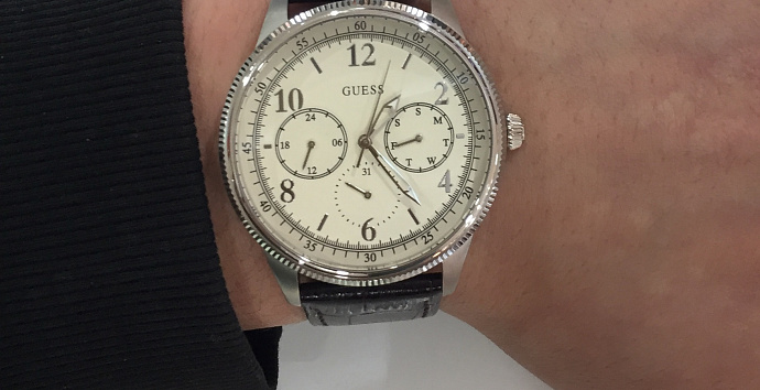 На новый год сделал папе подарок. Т.к сам предпочитаю этот бренд то и папе выбрал GUESS. Аналоговые часы с кварцевым механизмом. Циферблат цвета слоновой кости, с интересным размещением цифр. Минеральное стекло. Кожаный ремешок. Папа доволен и носит с удовольствием.